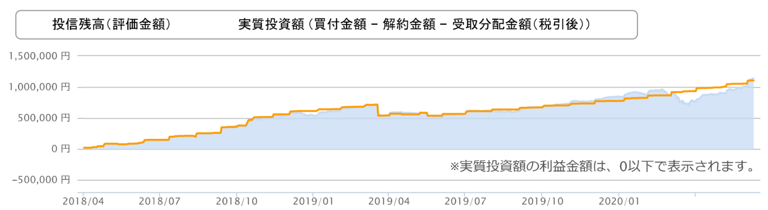 こちらの図は、オレンジ線が積立額、青色線が投資信託の評価額です。